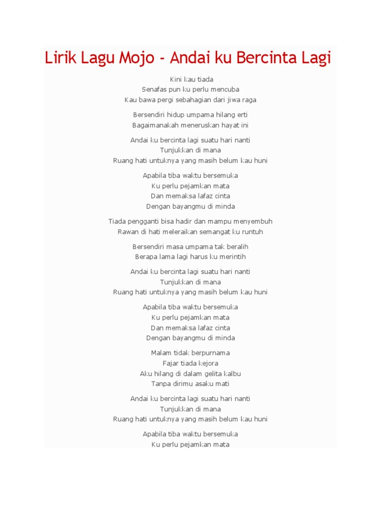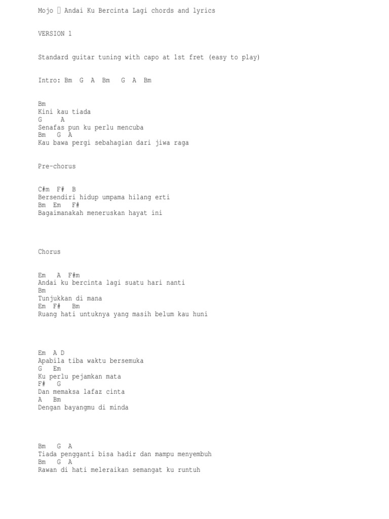 Rawan di hati meleraikan semangatku runtuh. Mojo - Andai Ku Bercinta Lagi Chord Intro Am F G Am F G Am Kini kau tiada F G Senafas pun ku perlu mencuba Am Kau bawa pergi F G sebahagian dari jiwa raga Bm E A Bersendiri hidup umpama hilang erti Am B7 E Bagaimanakah meneruskan hayat ini Dm G C Andai ku bercinta lagi suatu hari nanti F Tunjukkan di mana Dm E Am A Ruang. Lirik Lagu Andai Ku Bercinta Lagi Mojo Kini kau tiada Senafas pun ku perlu mencuba Kau bawa pergi sebahagian dari jiwa raga.